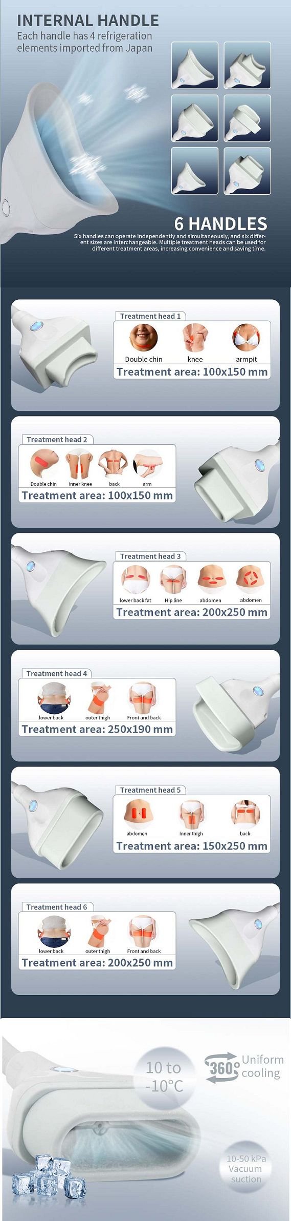 It’s a safe and non-invasive cryolipolysis, which does not affect normal work, doesn’t require surgery, doesn’t require anesthesia, doesn’t require medication, and has no side effects. The instrument provides an efficient 360° surround controllable cooling system, and the cooling of the freezer is integral and uniform. It’s equipped with 6 replaceable semiconductor silicone probes. The treatment heads of different shapes and sizes are flexible and ergonomic, so as to adapt to the body contour treatment and are designed to treat double chin, arms, abdomen, side waist, buttocks (under hips). Banana), fat accumulation in thighs 3 and other parts. The 6 handles can be working independently or synchronously. When the probe is placed on the skin surface of a selected area on the human body, the probe’s built-in vacuum negative pressure technology will capture the subcutaneous tissue of the selected area.