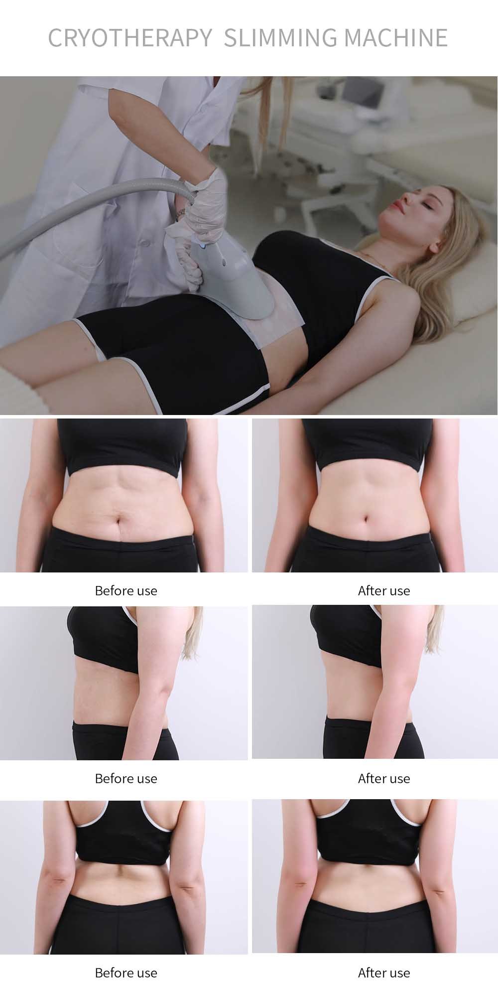 Before cooling, the precisely controlled freezing energy is delivered to the designated part. After the fat cells are cooled to a specific low temperature, the triglycerides are converted from liquid to solid, and the aging fat is crystallized. The cells will undergo apoptosis in 2-6 weeks, and then be excreted through the autologous lymphatic system and liver metabolism. It can reduce the thickness of the fat layer of the treatment site by 20%-27% at one time, eliminate fat cells without damaging the surrounding tissues, and achieve localization. Body sculpting effect that dissolves fat. Cryo can fundamentally reduce the number of fat cells, almost no rebound!
