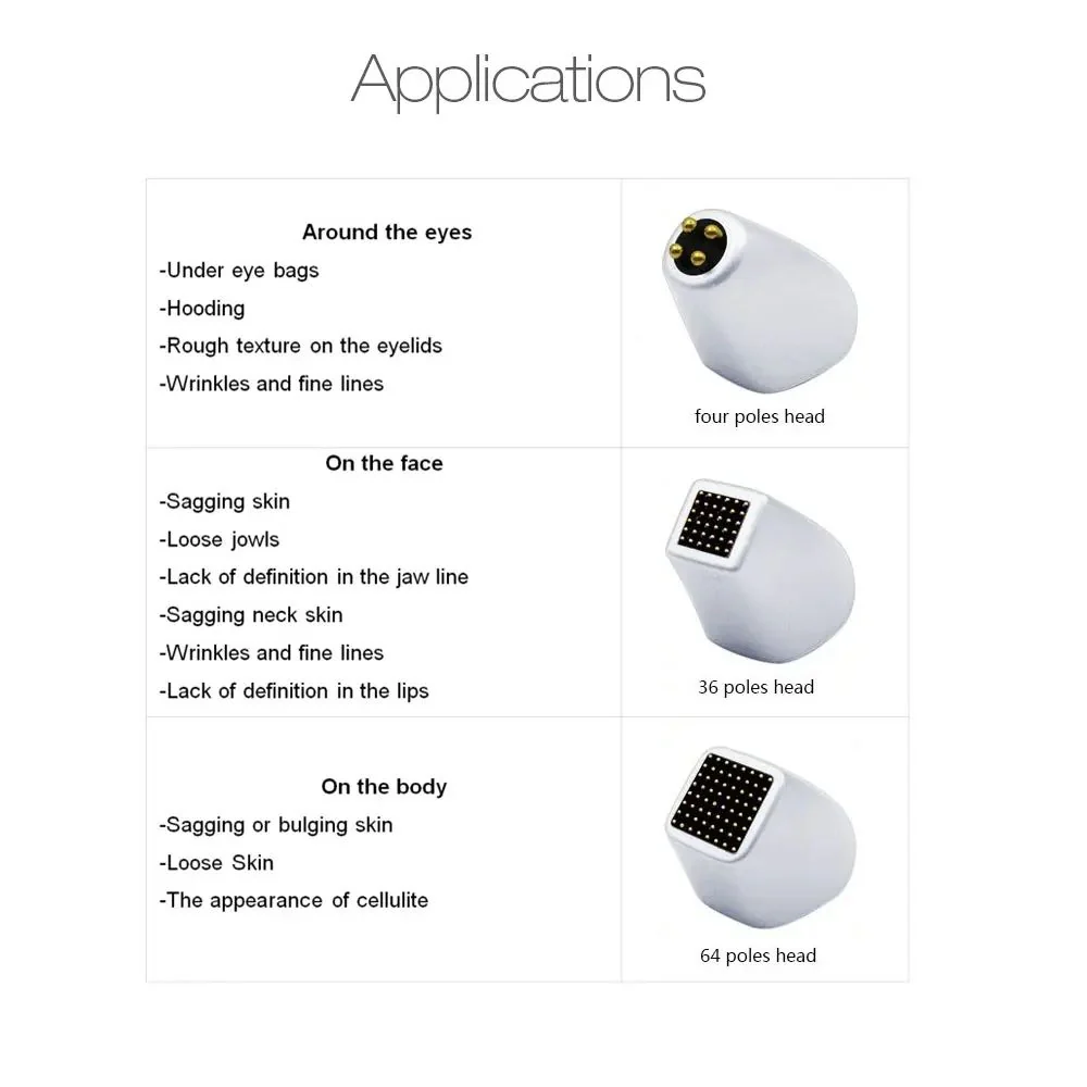 - Working head: Quadropolar RF, 36-pin Fractional Facial RF, 64-pin Fractional Body RF