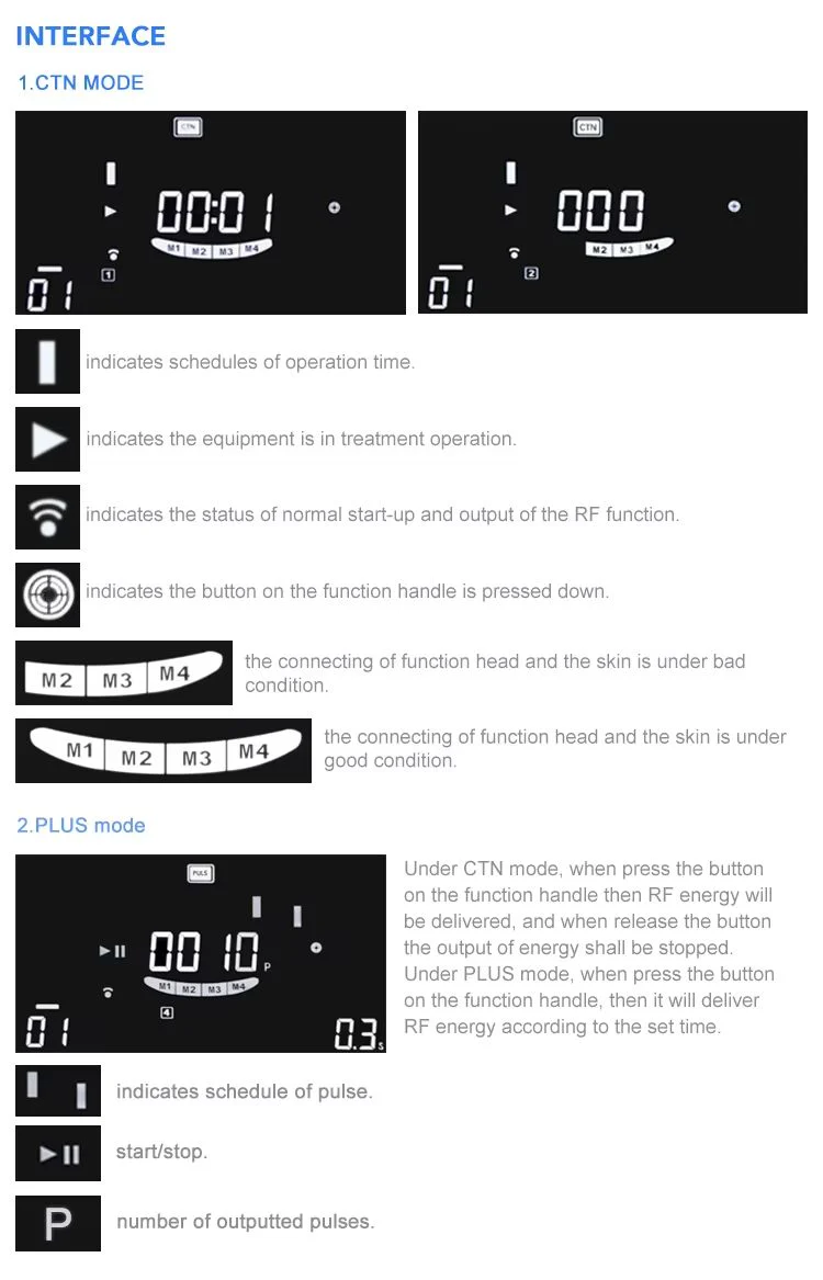 - Before operating the machine, please select the corresponding operation probe ac-cording to the position that will take the treatment, set the operating parameters, and it’s better to adjust the energy gradually from low to high degree till it satisfies the range the customer could endure.