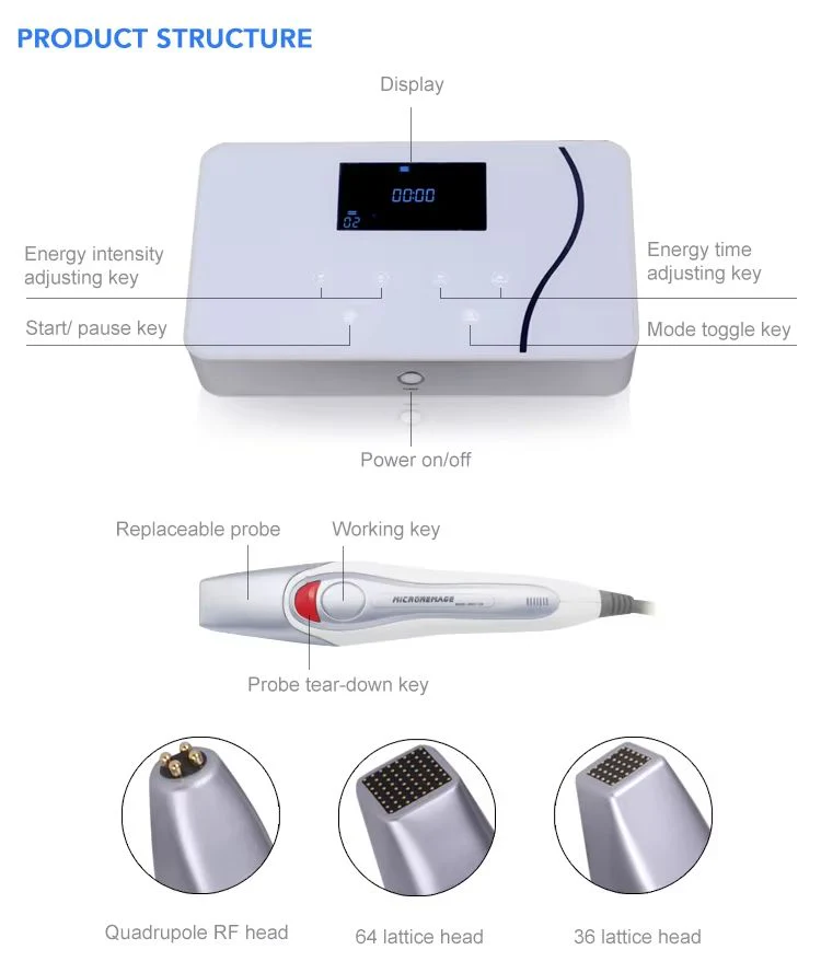 RF Fractional has the special design of many dot matrix array, the high speed digital motor controls orderly through the epidermis and dermis to accurate depth 0.2-3.5mm. The end of lattice gold coated point will release RF energy, strongly stimulate collagen and elastic tissues without any burning damages to the epidermal layer. The RF energy can well penetrate into the dermis layer, stimulate regeneration of collagen, soften, contract and decompose local fat tissues, so as to achieve long-term effects of skin lifting, wrinkle removal and facial tightening improvement.